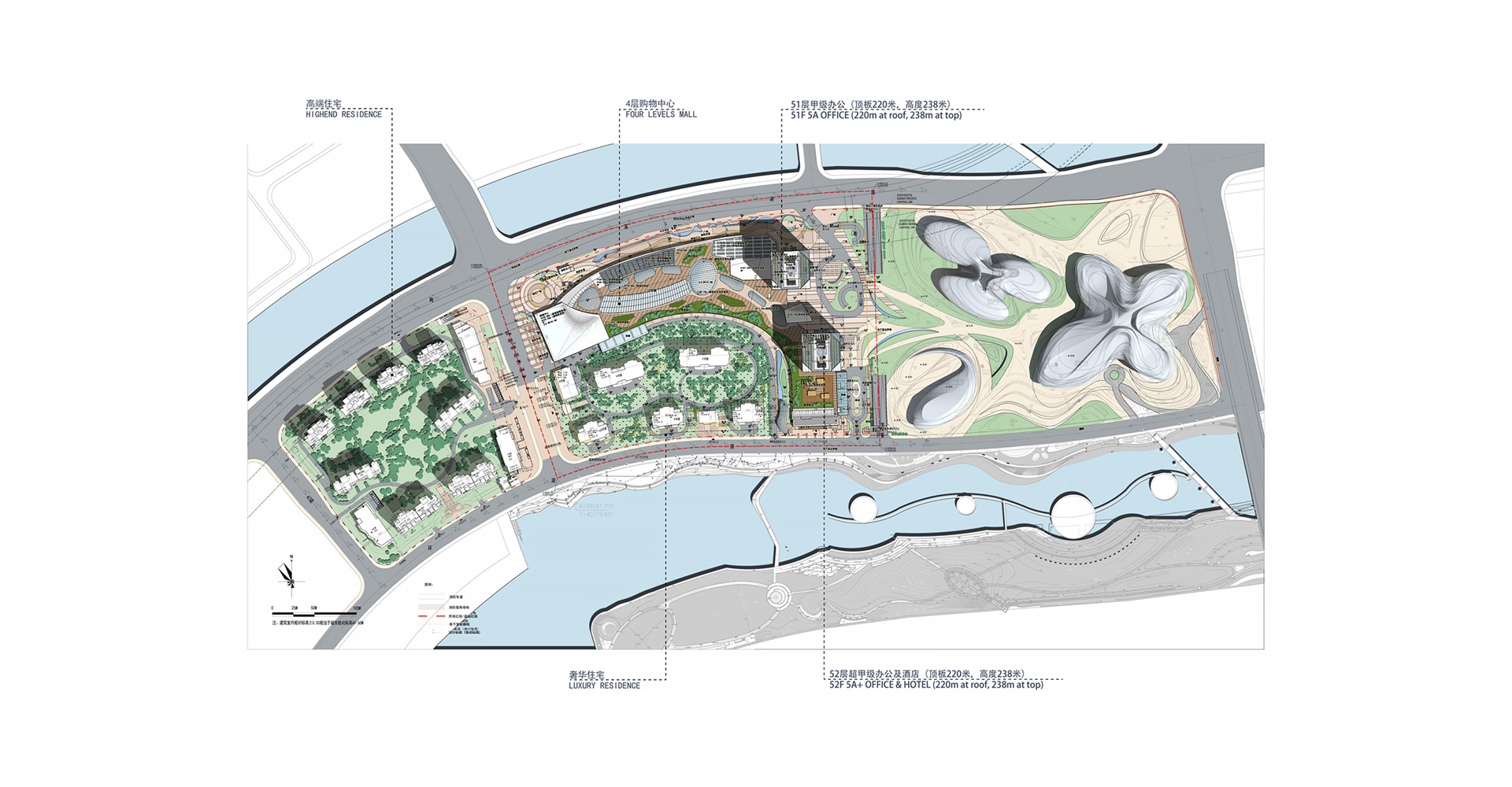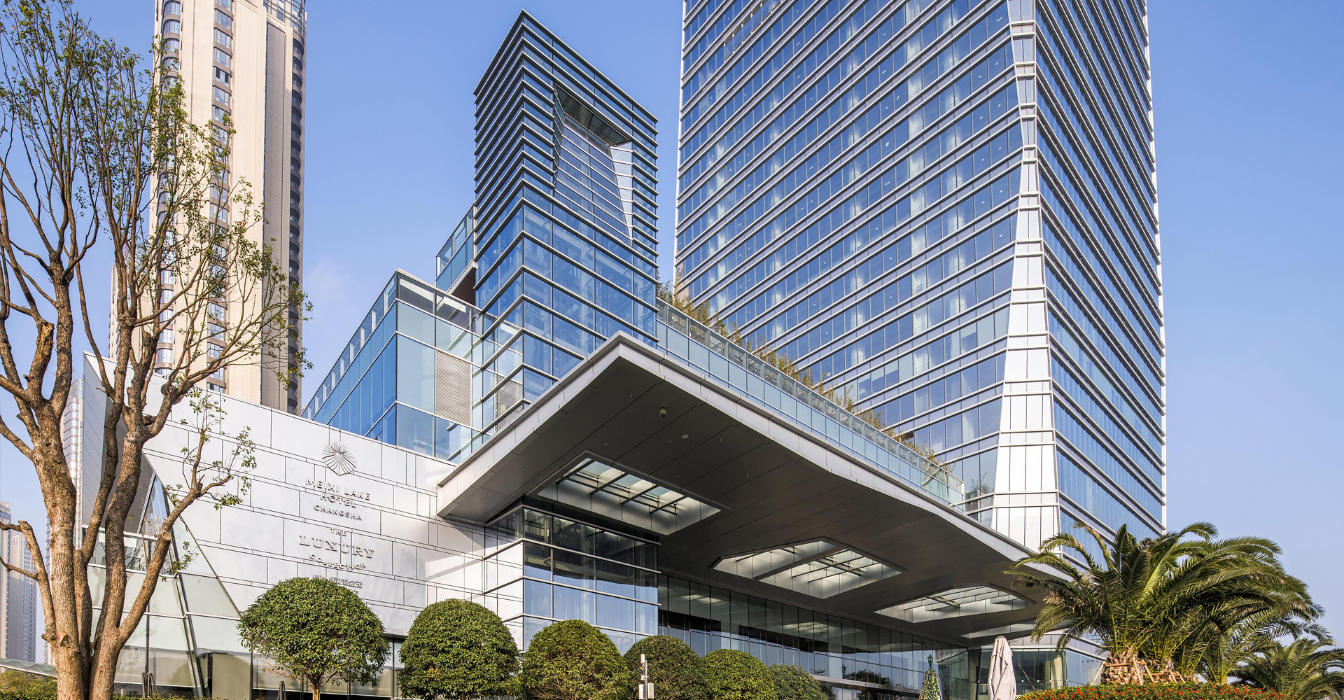 长沙金茂梅溪湖国际广场项目是金茂集团首个购物中心综合体项目,是集览秀城、喜达屋豪华精选(超五星)酒店、绿色豪宅以及高端写字楼的综合项目。在设计中,力求最大限度地集合多种业态于一体,充分利用地块的景观资源优势进行规划布局,注重建筑与场所的关系,各功能体之间相互借势,共同提升价值。从湖中及沿湖景观带上均有非常好的观赏角度,项目的形象极为突出,在塑造滨水城市形象方面有重要的作用。