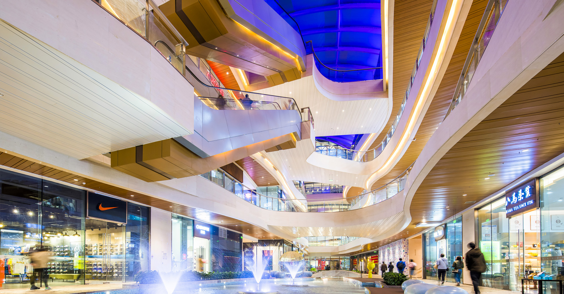 建筑内部动线通过室内室外两条商业街创造了丰富的购物体验,将多种水景,引入室内和室外的场所,引导客户从项目西北角的地铁入口,直至南侧梅溪湖岸边。通过精心布局、动线组织、景观和水景结合,使览秀城突破传统购买中心定义,成为一个综合滨水体验中心。