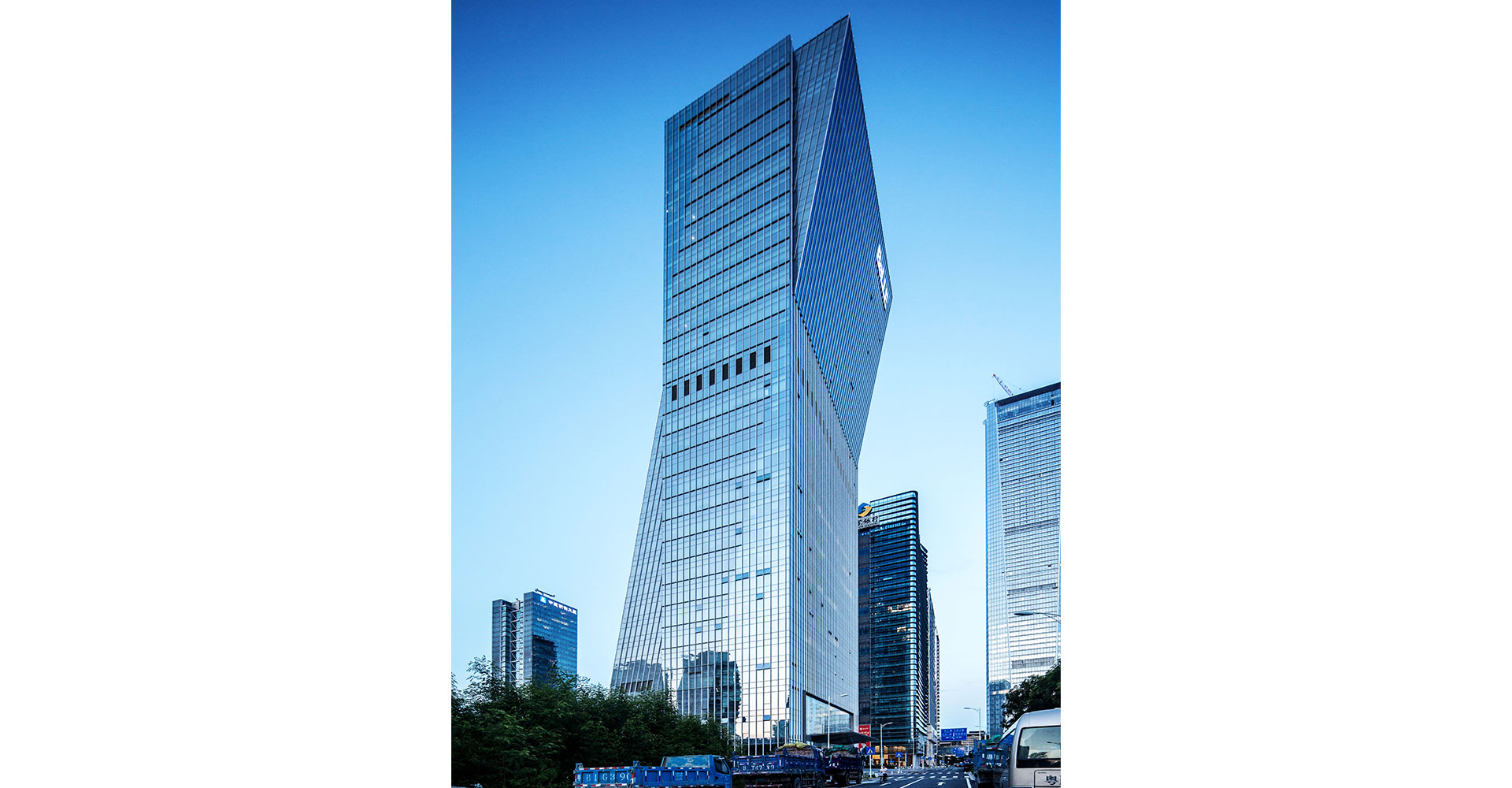 结构形式采用框筒结构,倾斜的柱子顺应建筑的外轮廓,结构造型和建筑造型结合在一起。