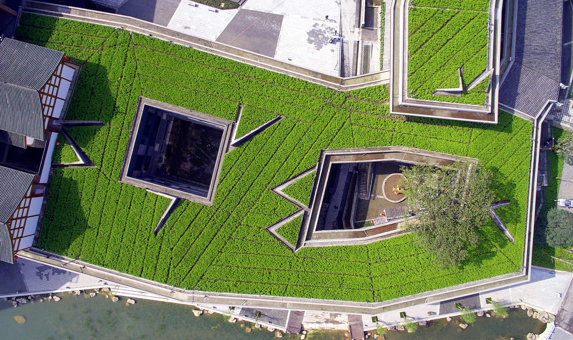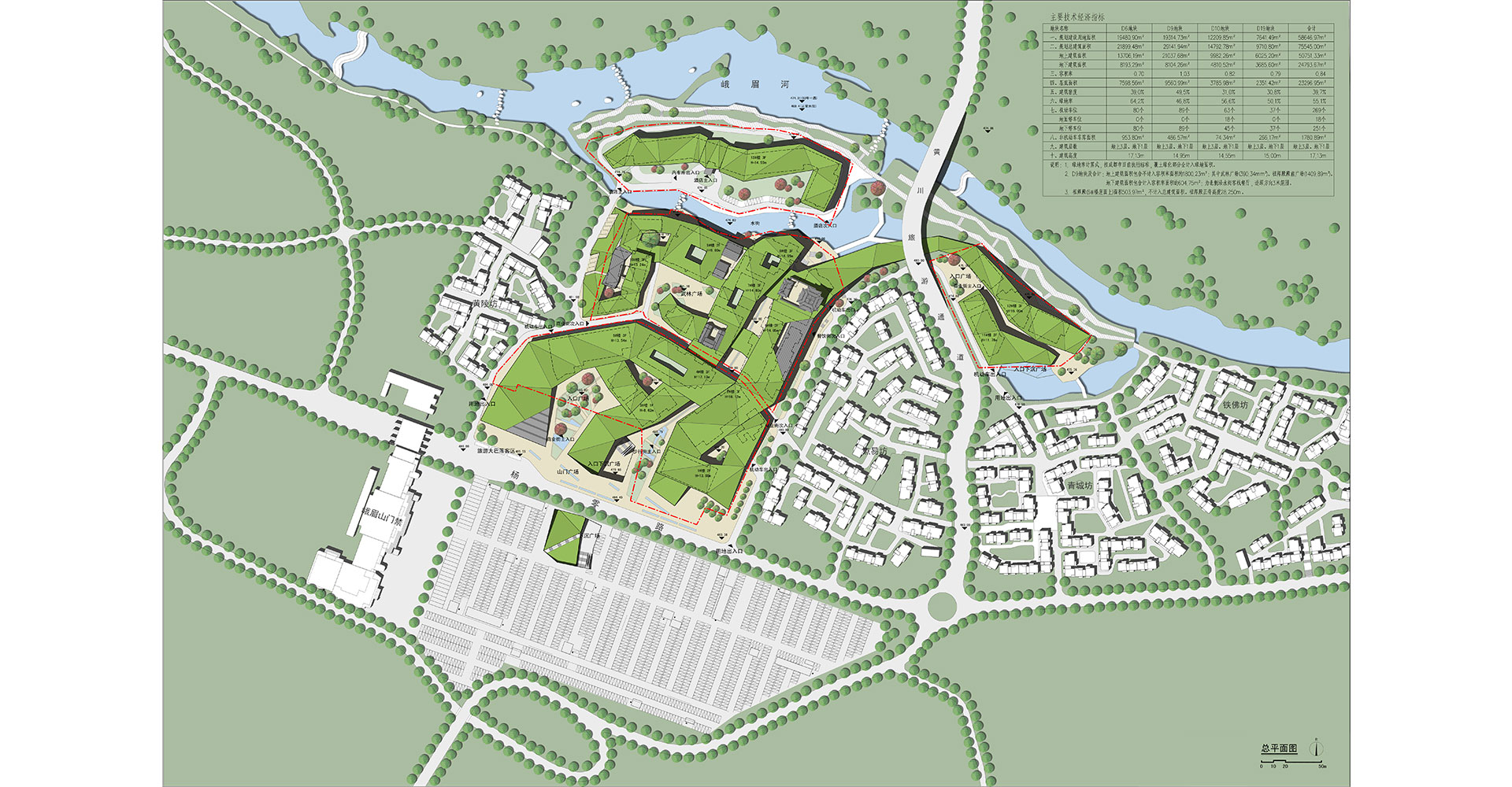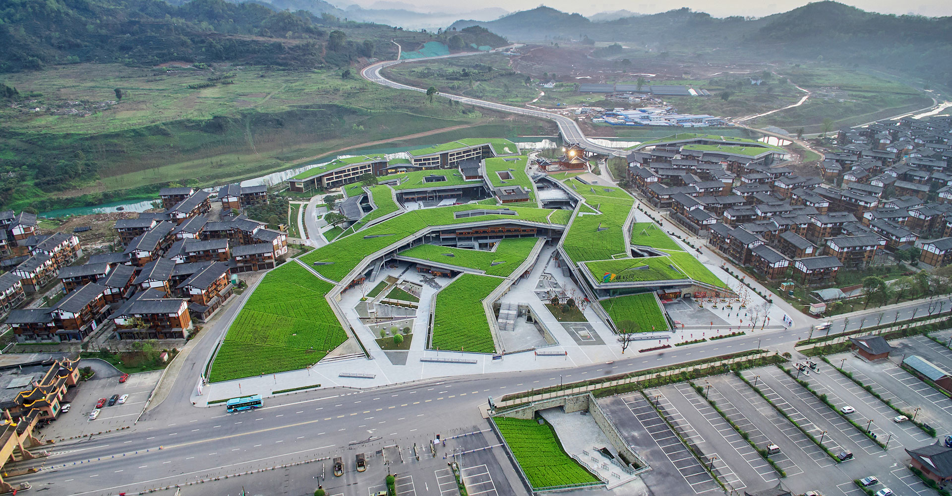 项目位于峨眉山景区入口处,南临杨零路,北临峨眉河,东西两侧地块是农民回迁组团。作为峨眉山景区高端旅游接待的特色小镇,应当与周边回迁组团的民俗接待在目标客群、消费水平、物业价值等方面进行差异化设计,才能与之形成多层次的旅游接待能力并达到商业价值的双赢。设计利用地形高差与种植屋面的起伏打造出一种“浅丘”的形象,并运用减法的方式营造其内部的街巷与广场空间。这是一种大地景观的设计思路,利用起伏、层叠的绿色屋面将建筑形体低调地融入周边自然环境。用地南侧随着“浅丘”自然形成的建筑退线,最大限度地弱化了小镇建筑对杨零路的视觉压迫感,并与两侧回迁组团形成了“丘陵上散落着自然村落”的既视感。