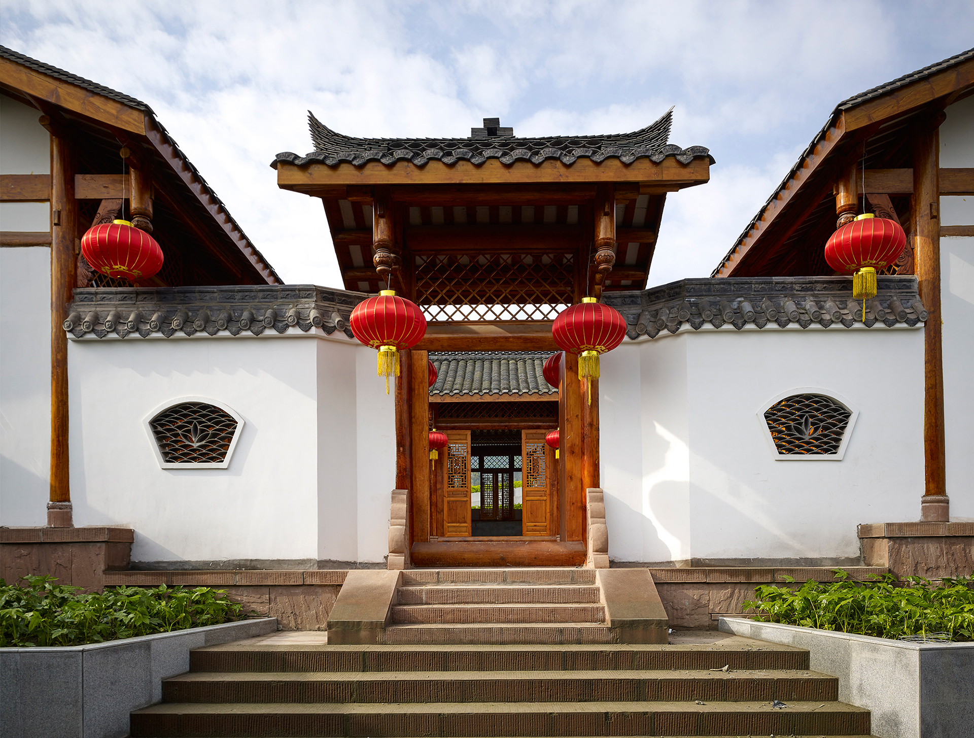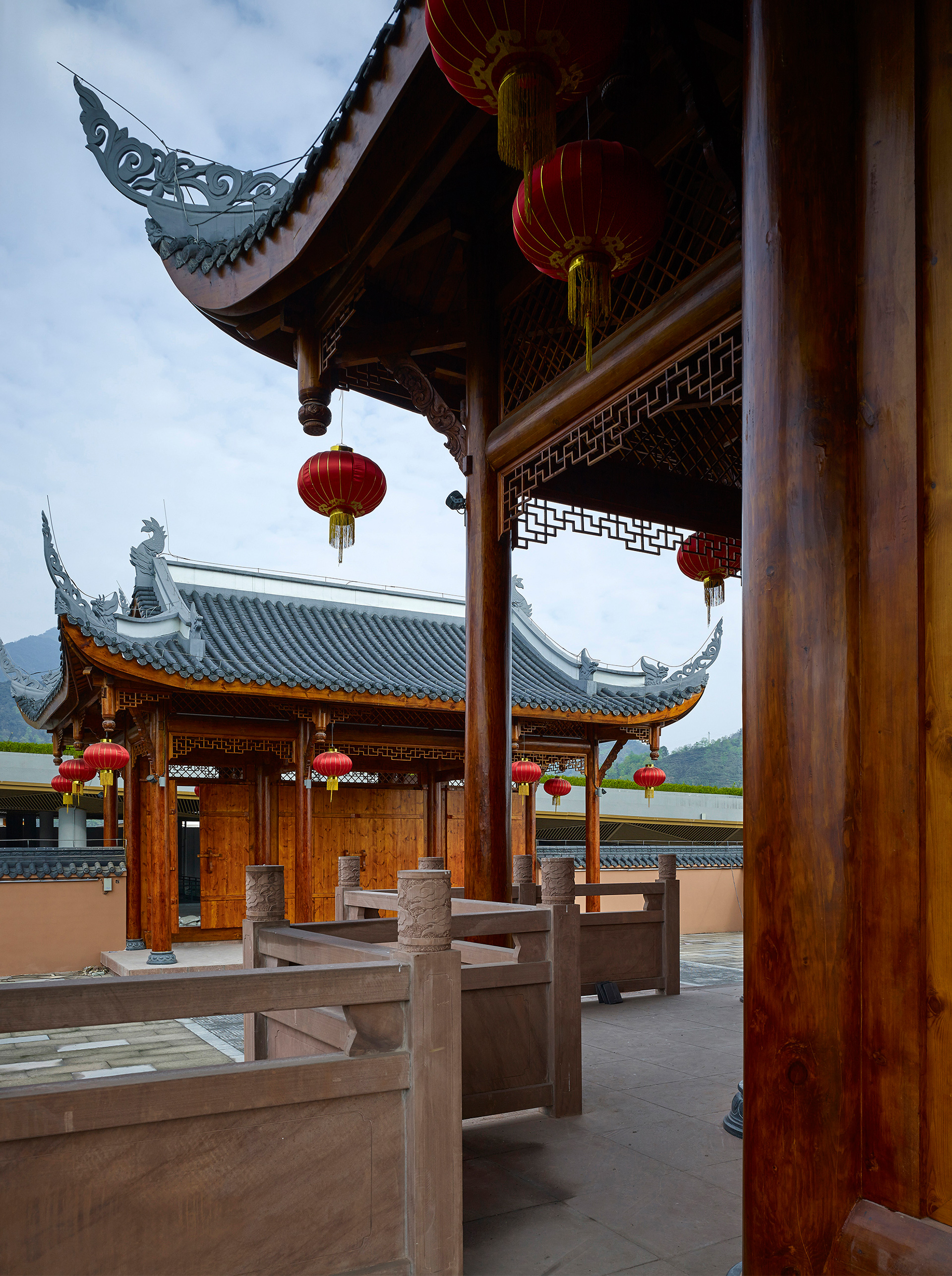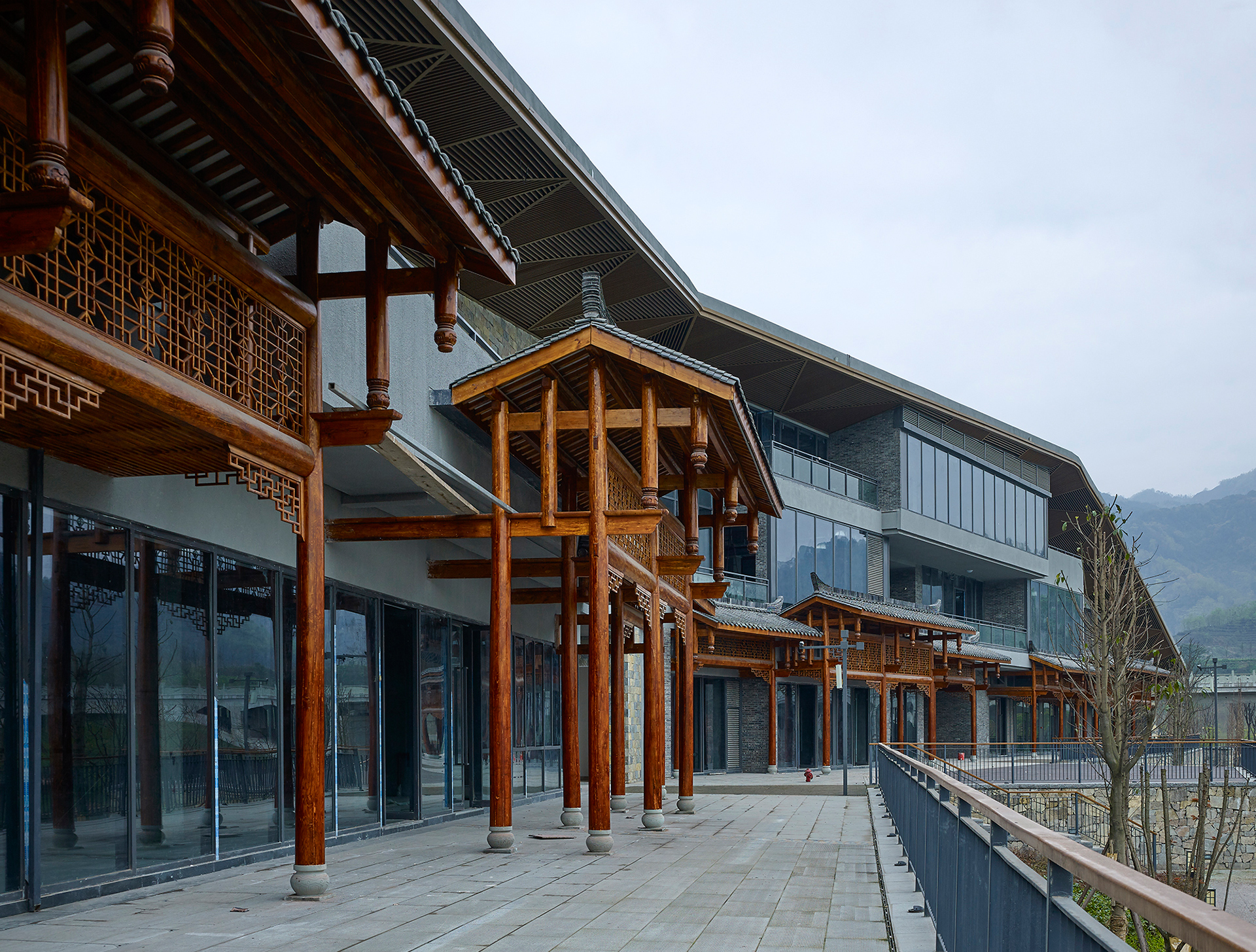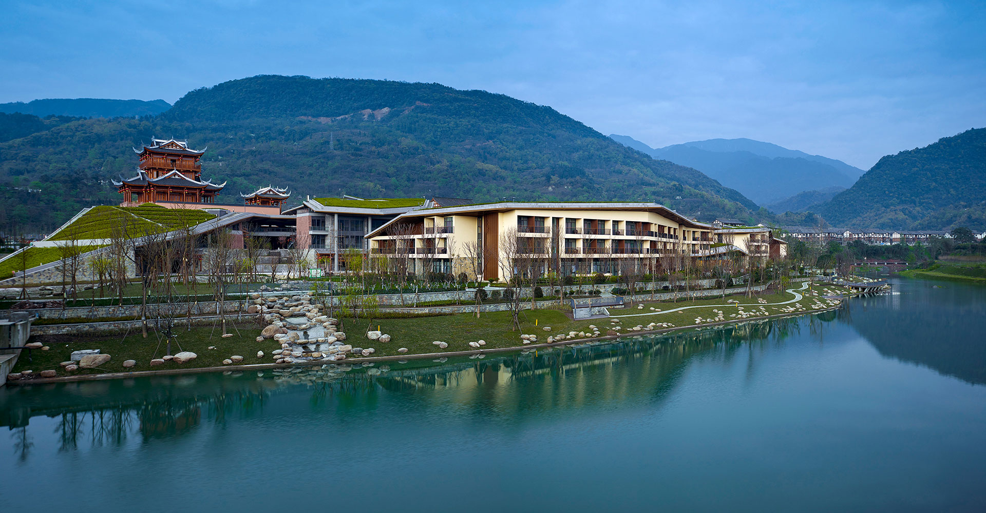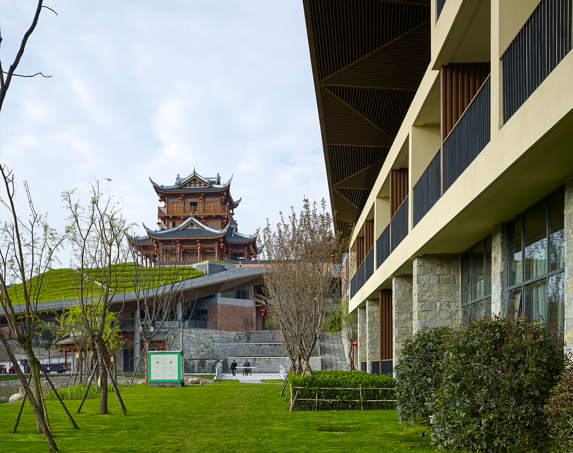 在覆土屋面之上,依托现代手法的大地景观,点式散布三处传统川西木结构建筑:峨嵋武术祖师殿、峨眉客栈和峨眉民居。其中,祖师殿高约28米,位置选在峨眉山东麓过境桥边的屋面高点,是小镇的地标性建筑,也是未来整个旅游片区的视觉焦点。