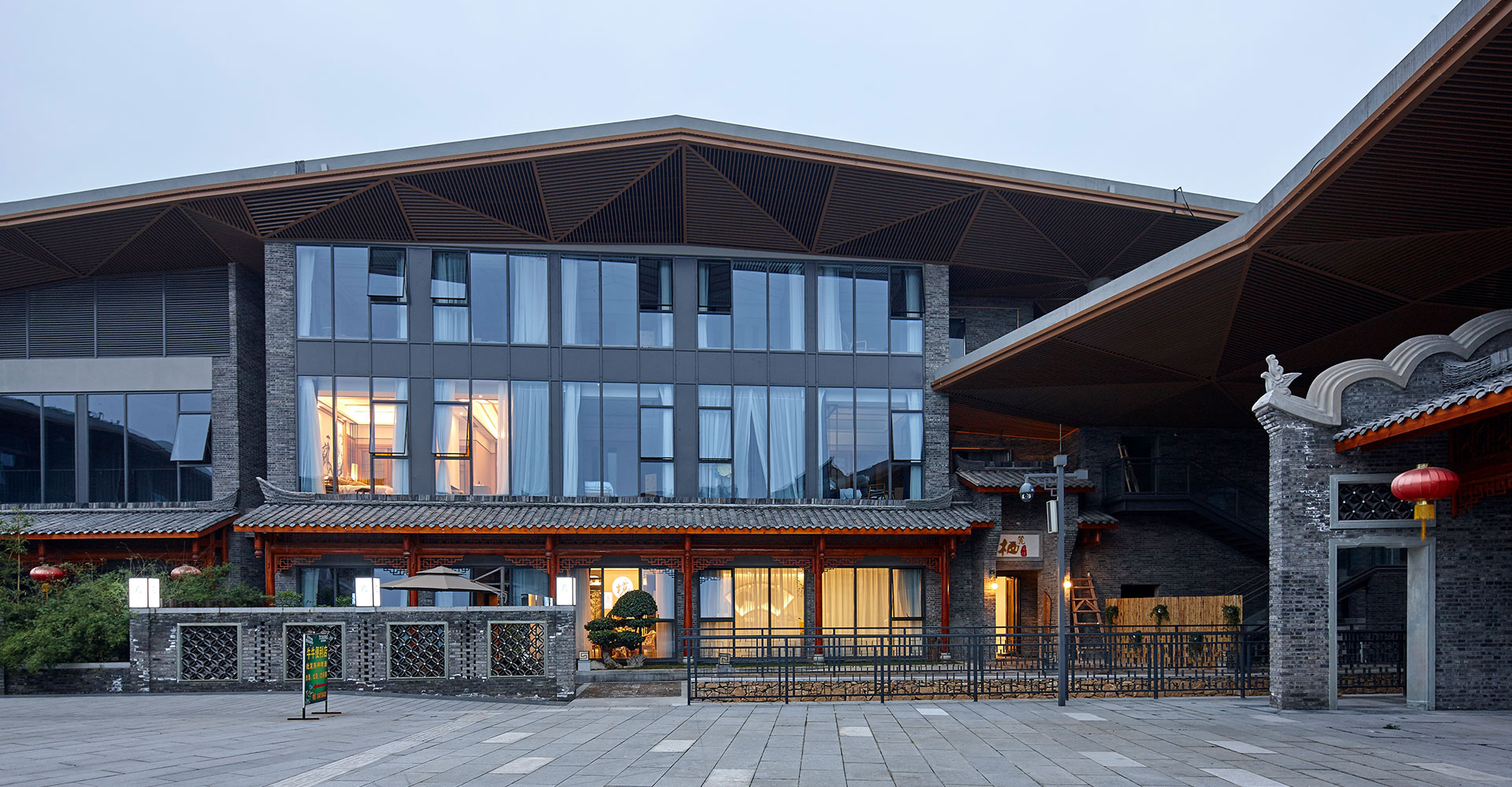 立面设计不仅从川西民居、寺院等提取要素,设计符合当地特色的建筑形象,同时还提出了传统与现代碰撞形成旅游趣味性和标志性的设计理念。将川西传统门头与现代的玻璃幕墙相结合,局部墙面辅以红色雅石,体现出当地的材料与文化特征。标准化的空调室外机位和店招设计,提供了适应现代商业功能需求的室内外空间。