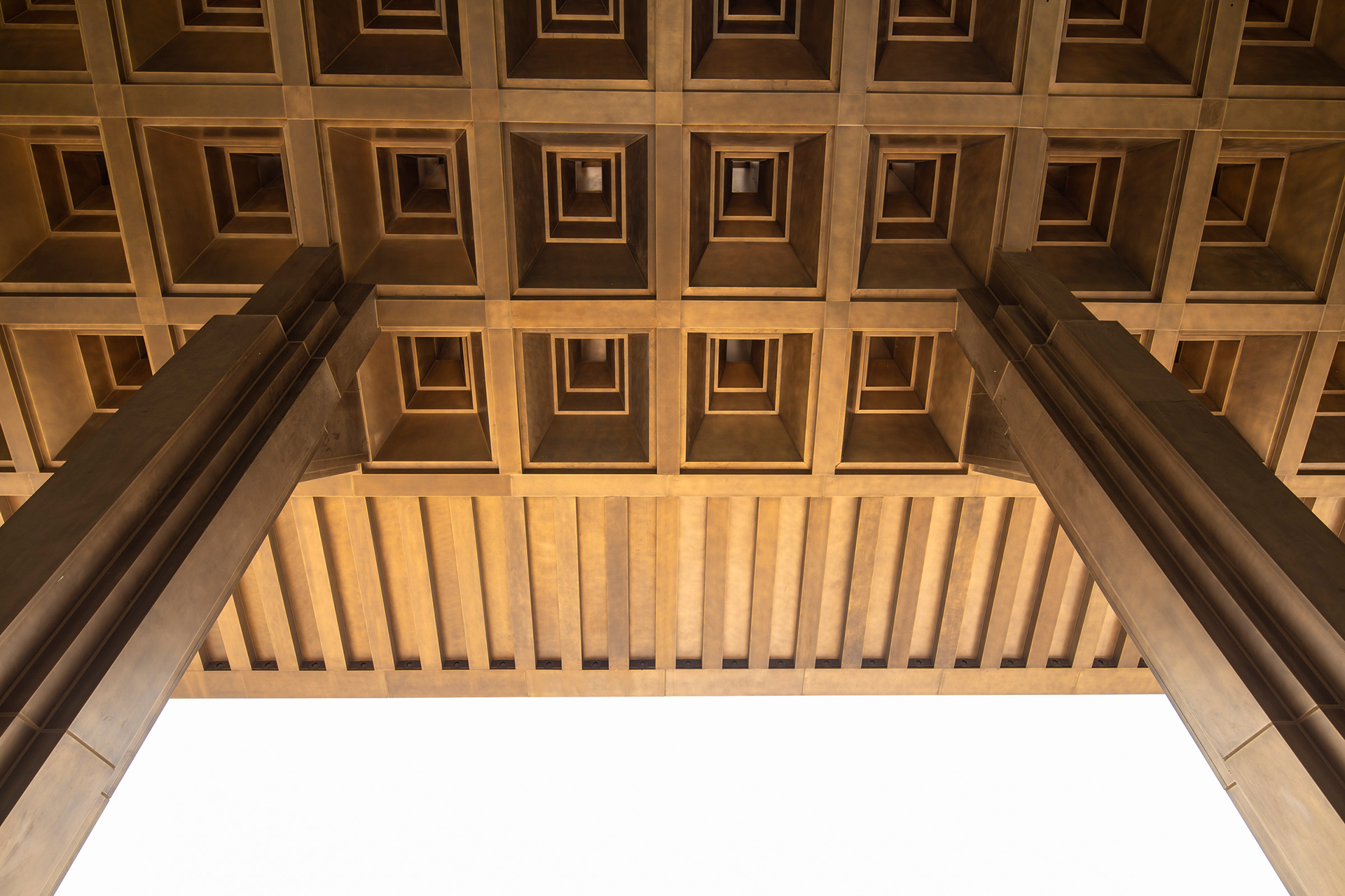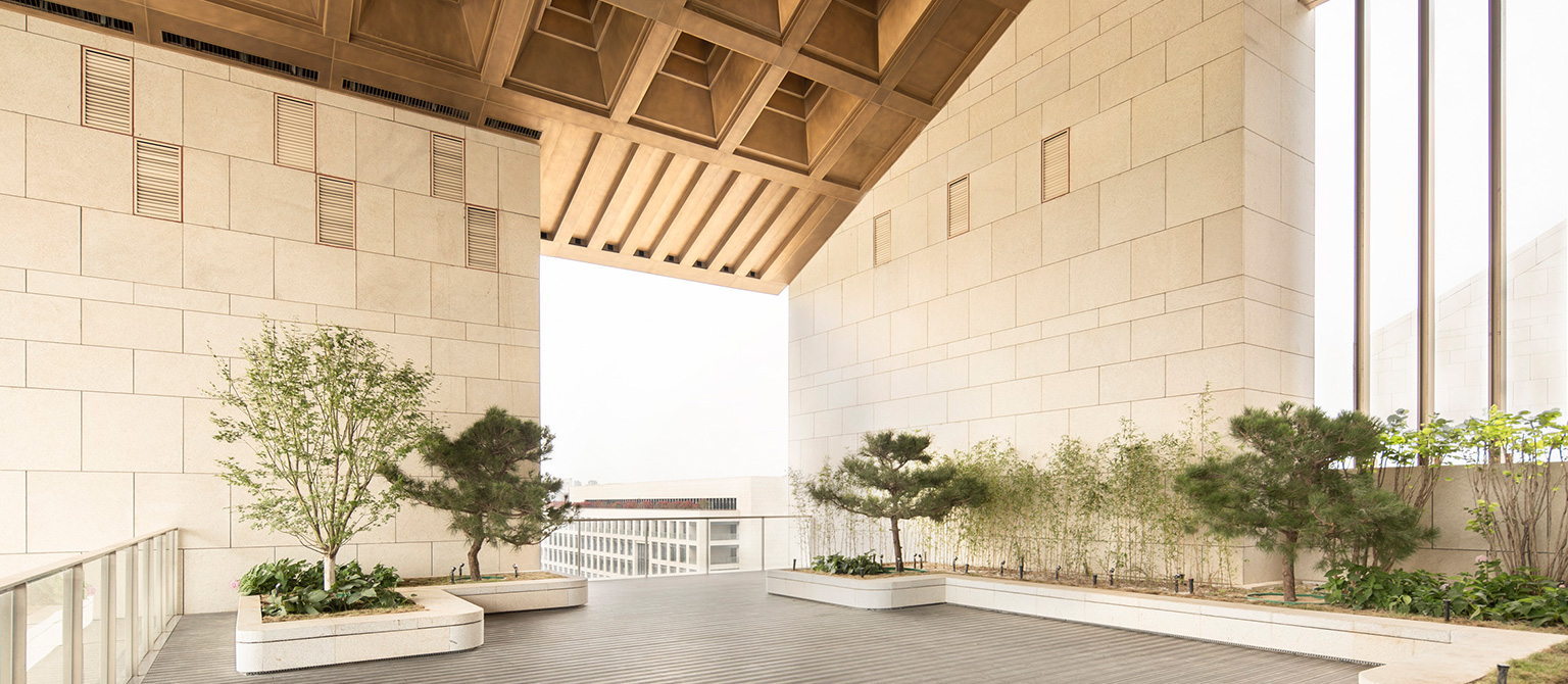 新中式坡屋面与周围自然环境融合,石材幕墙厚重典雅,简朴庄重,檐口下的吊顶部分采用藻井式处理营造出中国传统建筑屋檐处的空间氛围。