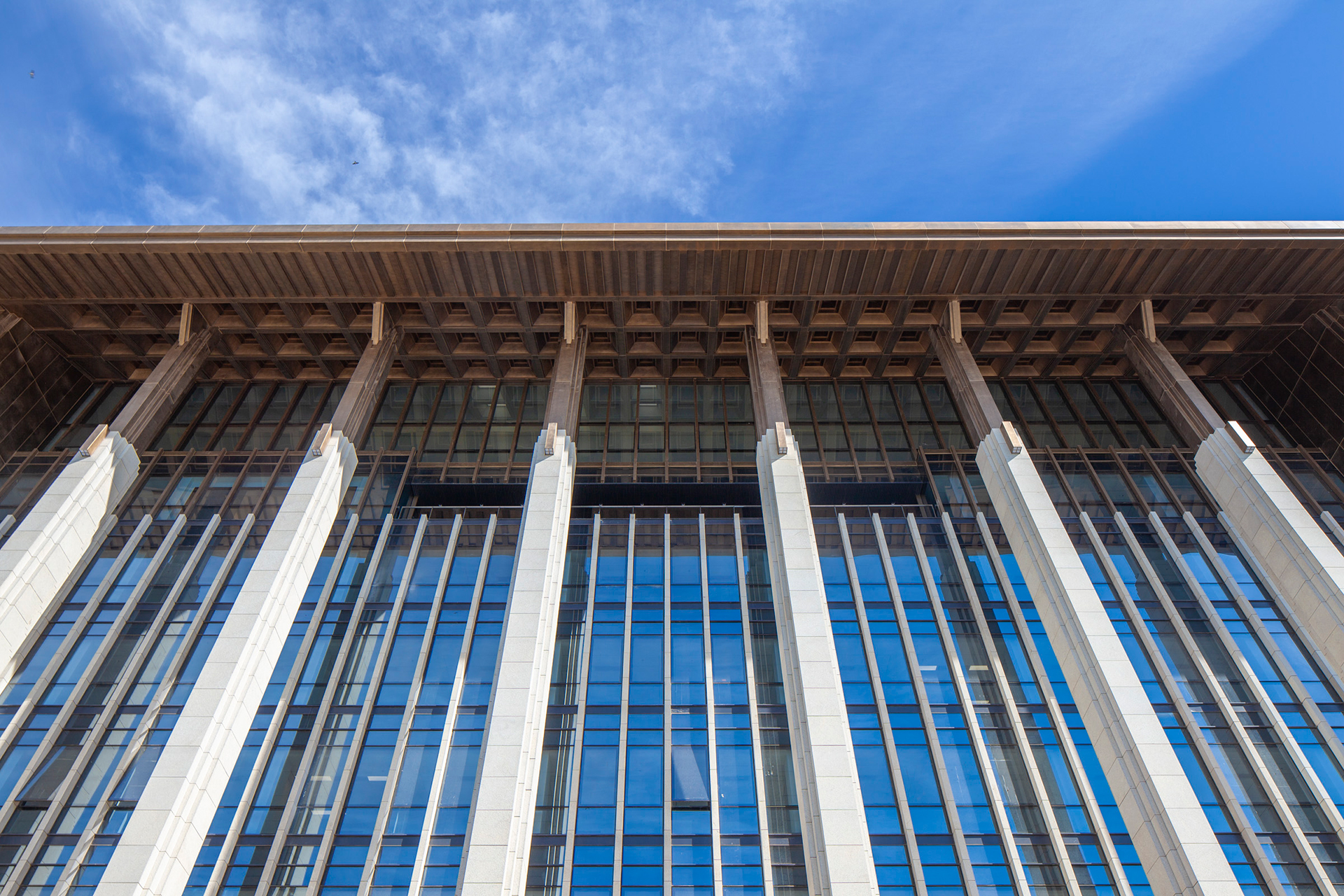 北会议楼的大报告厅为25.2x42m无柱空间,顶部采用现浇钢筋混凝土屋面板,结构采用25.2m跨,总34m长实腹钢梁实现大跨度屋盖。东西院设有13m跨钢连桥,采用大跨钢梁+钢柱+高强钢拉杆结构形式,以提高钢连桥整体刚度。主楼大坡度弧形钢筋混凝土屋面建筑造型复杂,设计中通过合理设计配筋,严控施工措施要求,确保结构完成质量。主楼主入口6棵40.5m高门头柱,结构采用1600x1000钢格构柱沿高度变截面,既确保了超高独立柱的结构安全,又节省了钢材,实现了门头柱的复杂建筑造型。