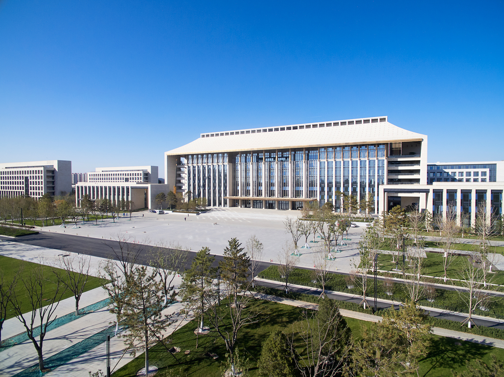 行政办公区一期工程—市委组团从前期规划到单体设计积极主动地落实了“创新、协调、绿色、开放、共享”的发展理念。力图打造能够满足当代政府需求、展现当代政府形象,具有前瞻、经济、共享、绿色特点的“千年大计”。项目坐落在行政中心中央,是一组中轴对称建筑,采用以院落空间为核心的布置方式。各院落空间彼此分隔,又相互联系,兼具秩序性和层次感。