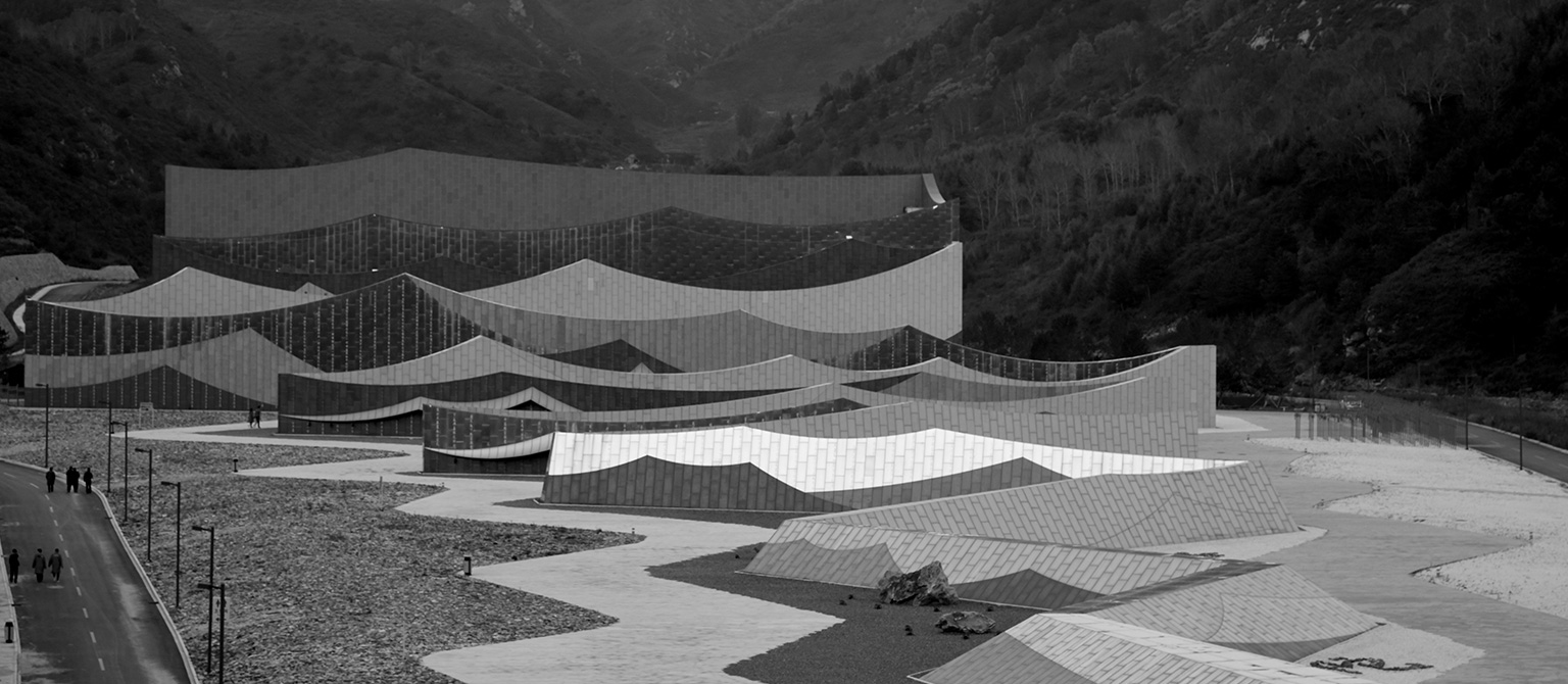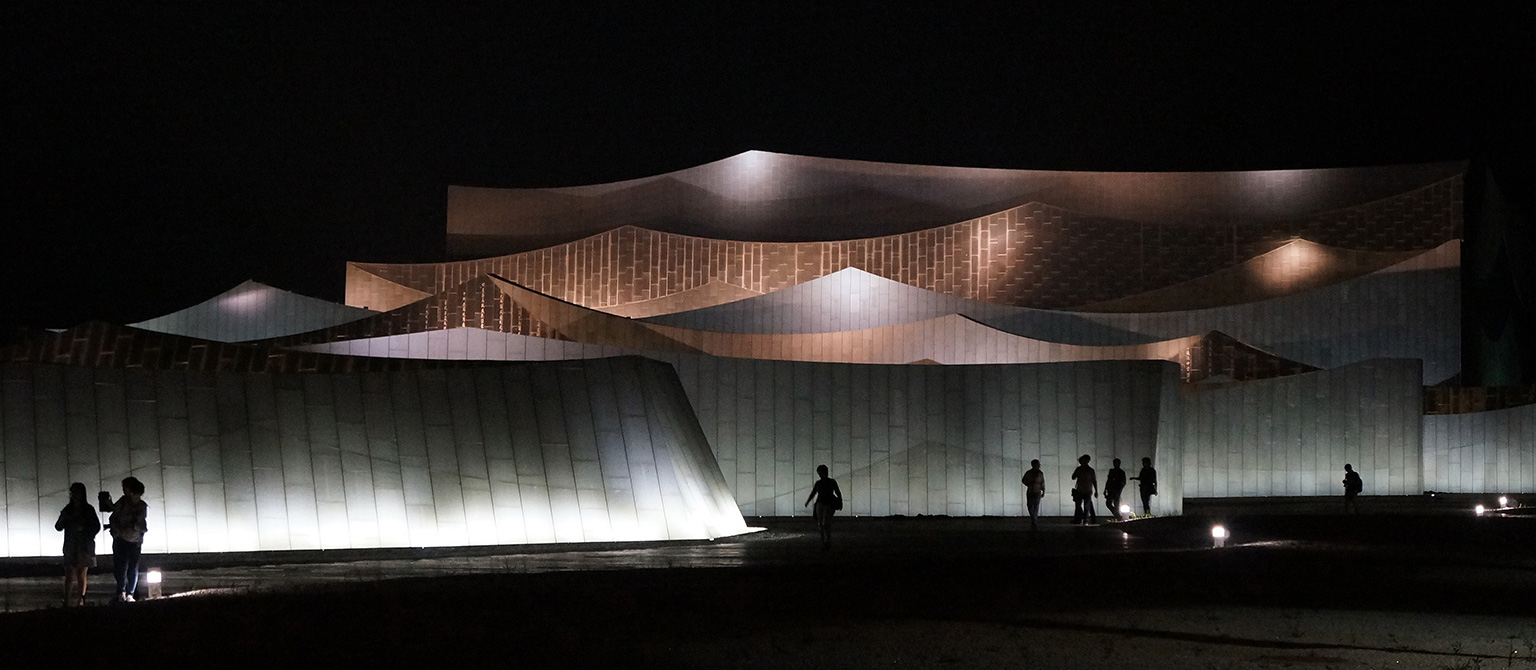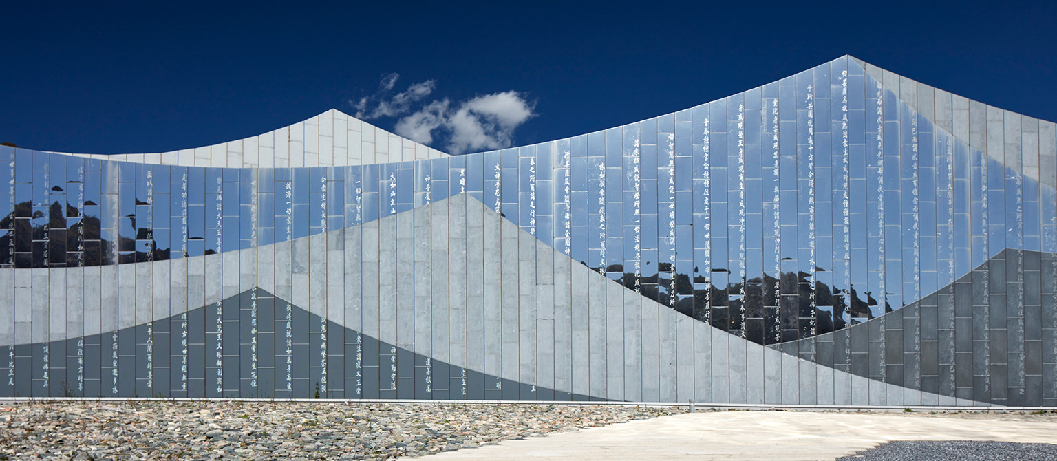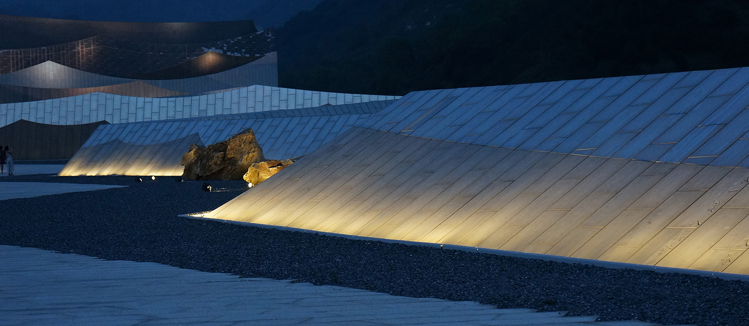 她以约700米长、徐徐展开的“经折”置于剧场之前,由高到低排列形成渐开的序列,成为剧场表演前奏的序曲,承载着让游人平复情绪、感知所在的功能。而剧场就成为了还没有、或正在被打开一本博大的经书,预示蕴藏着知识和智慧的宝库。在接近景区道路的一端,“经折”以高反光的不锈钢顶面直接插入碎石的地面,突出了“经折”构造的力度和纯度,对日空和月夜的映照成为最先映入观众眼帘的形象。
