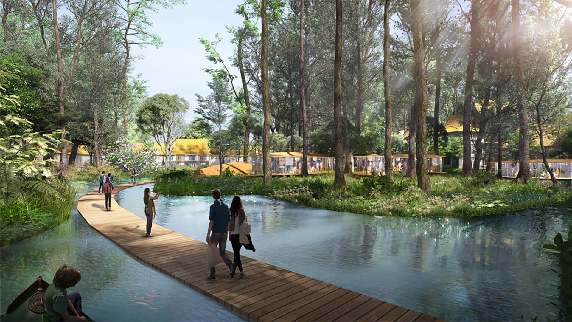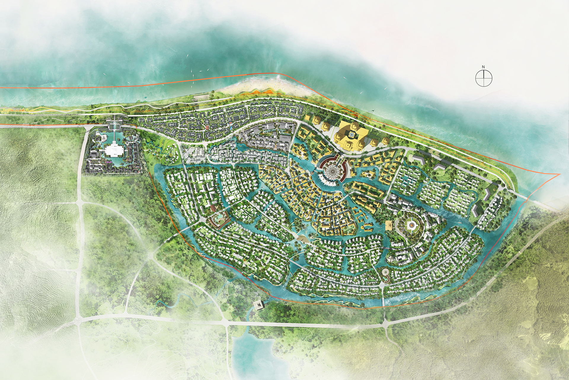 江心岛以连续的水系串联贝叶群岛、澜沧理想国和古河秘境三大功能主题片区:贝叶群岛片区呈现为六国水城,体现宗教、历史盛世主题,建筑功能为餐饮零售、民宿集市。澜沧理想国片区呈现高端现代的滨江建筑,体现文艺、年轻发展主题,建筑功能为文化演艺、商务酒店和高端公寓。古河密境片区则呈现东南亚悠然宁静的栖居场景,体现生态、禅修主题,建筑功能为为邻里中心和精品商墅。