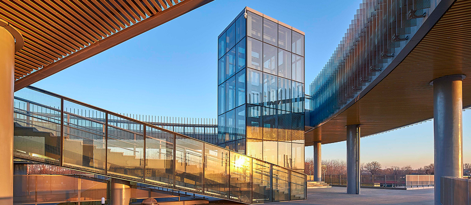 二层环廊,建筑造型要求为单排环形框架柱两侧悬挑钢梁,两侧悬挑长度随框架柱位置和板边线的变化而变化,为提高结构抗震性能,二层环廊采用钢管混凝土柱框架结构,并进行中震弹性性能化设计,楼盖采用密肋钢梁+闭口型压型钢板组合楼承板,其中,钢管混凝土柱内浇注C40灌浆料,钢管混凝土柱之间采用箱形钢梁连接,并从钢管混凝土柱和箱形钢梁上悬挑工字形钢梁。