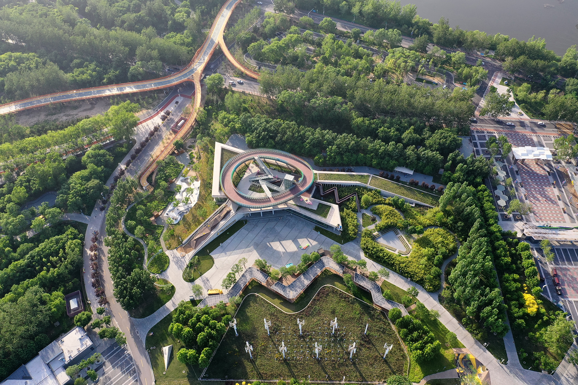 低碳生活馆的覆土草坡弱化了建筑的体量,使之宛如从地面生长出来,与周边环境更好结合。建筑一层总体分为4 个部分,参观游客由南侧主入口进入大厅,公共区域依次串联了展厅、休息厅及后勤辅助空间。展厅内部以“自然警示、取之有道、用之有度、南湖变迁、低碳唐山”为展陈主线。