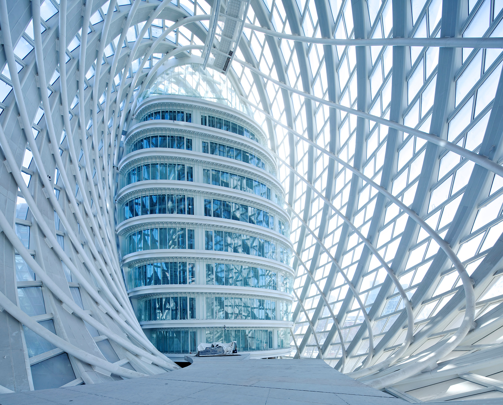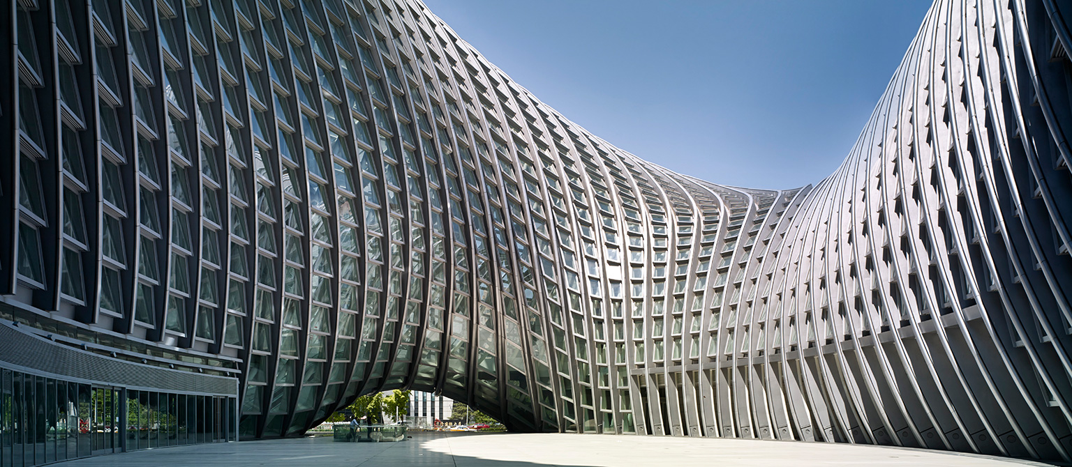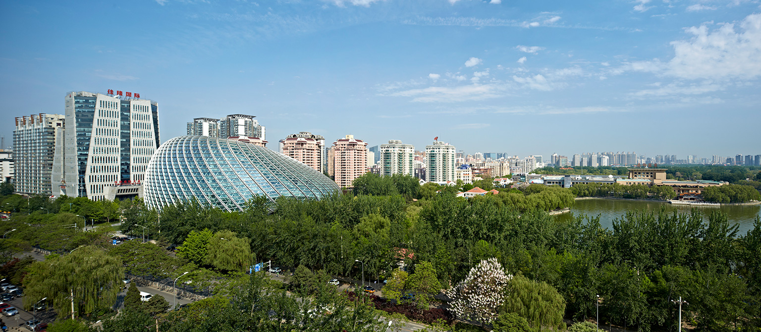 此外,整个建筑也体现了对绿色节能和低碳环保的设计理念。光滑外形没有设一根雨水管,所有在表皮形成的雨水顺着外表的主肋导向建筑底部连续的雨水收集池,经过集中过滤处理后提供艺术水景及庭院浇灌。建筑具有单纯柔和的外壳,除了其自身的美学价值之外,也有缓和北京冬季强烈的高层建筑的街道风效应的作用。建筑外壳同时又是一件“绿色外衣”,它为功能空间提供了气候缓冲空间。建筑的双层外皮很好地提高功能区的舒适度和建筑能耗。设计利用数字技术对外壳和实体功能空间进行量体裁衣,精确地吻合彼此的空间关系。共享空间利用30米的高差的下大上小的烟囱效应,在过渡季中,可以形成良好的自然气流组织,节省能耗。