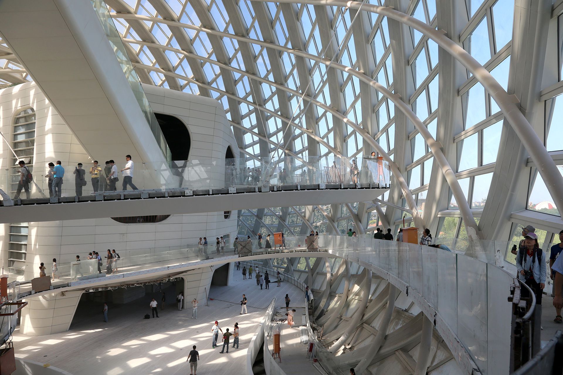 3.连体结构 地上的办公楼和演播楼通过外壳钢结构围合在一起;同时有钢结构的通天梯、旋转坡道、东西拱桥将办公楼和演播楼连接起来,形成了复杂的受力、传力体系。