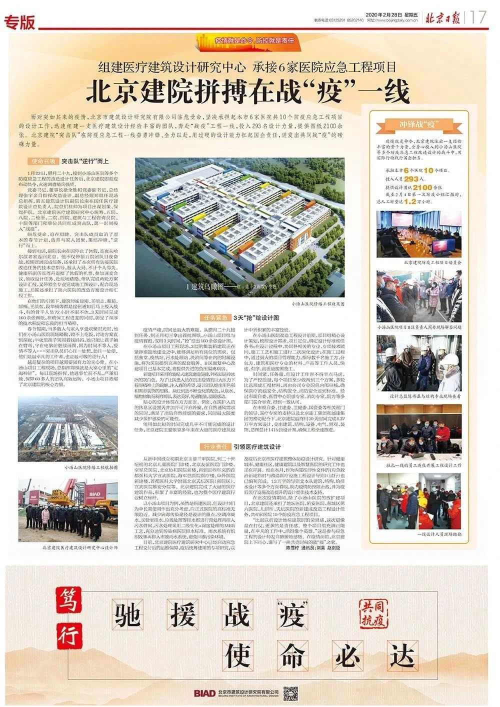 “比起以前设计地标建筑时的荣誉感,这次更像是在打仗,更多的是责任感。整个项目组充满正能量,在平凡的工作中,活得像个英雄。”这是参与应急工程的设计师发自肺腑地感慨。在疫情面前,北京建院上下同心,谱写了一曲共克时艰的战“疫”之歌。
