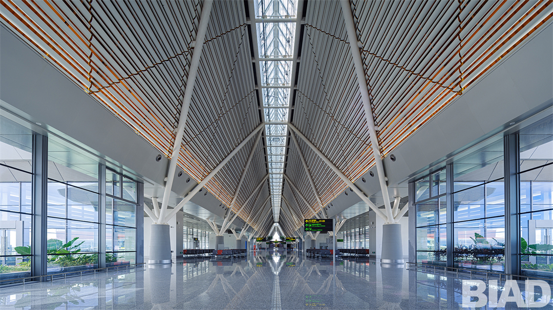 机场航站楼总面积8.18万平方米,采用了简洁的T字构型,未来可向两侧发展候机指廊及机场附属设施,向陆侧发展临空开发项目。作为世界文化遗产-吴哥窟所在城市的门户机场,设计团队注重吸取传统精华,在人文、气候等方面着力体现建筑的地域性。航站楼各功能区的体量相对拉开,加大建筑的开敞面,以利通风散热。双坡屋面、挑檐深远,以利排水和遮阳。建筑采用了模数化-单元式设计,以外露的斜撑结构支撑屋面,以三角网格控制造型,以现代建筑语言传递“吴哥印象”。