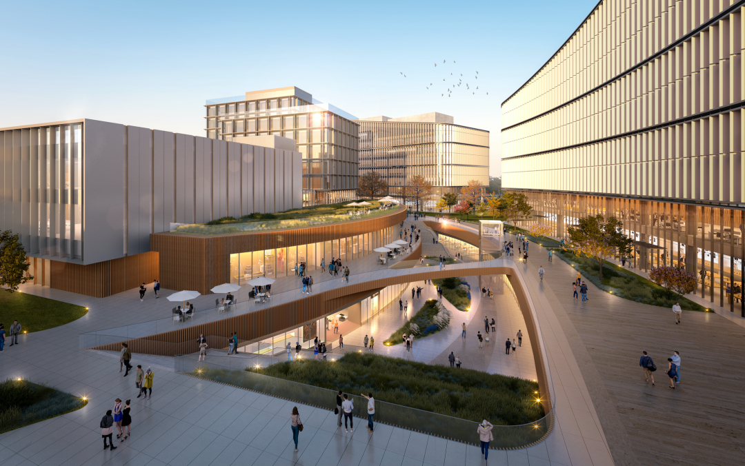 项目设计以城市界面和园林内核作为切入点,通过外城与内院的一体化建构,使园区兼具城市的外在形象与园林的内在灵动,将多个地块联络贯通,形成一座巨大的、开放的、具有园林意境的城市科技花园。海淀昌平分界线位置处的东侧界面龙形蜿蜒,凸显了园区信息门户的形象。园区内包括不同规模的企业办公空间以及会议中心,体育中心,商业店铺及孵化型办公等服务设施,为科创园区提供完善的社区化服务。