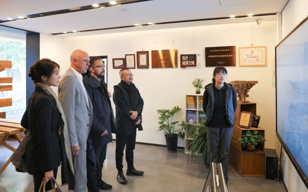 Burkhard Junker一行参观以礼士书房为代表的既有建筑改造,了解了北京建院悠久的历史,以及北京建院在图书收藏、学习交流、文化展示等方面的成果;观看了中国古代大木作技艺和中国传统文化的榫卯结构,惊叹其悠久的历史、巧妙的构造与深厚的智慧;参观了人民大会堂宴会厅、毛主席纪念堂、北京饭店等著名建筑顶棚、柱子以及灯花的油漆彩画,感受建院书香文化。