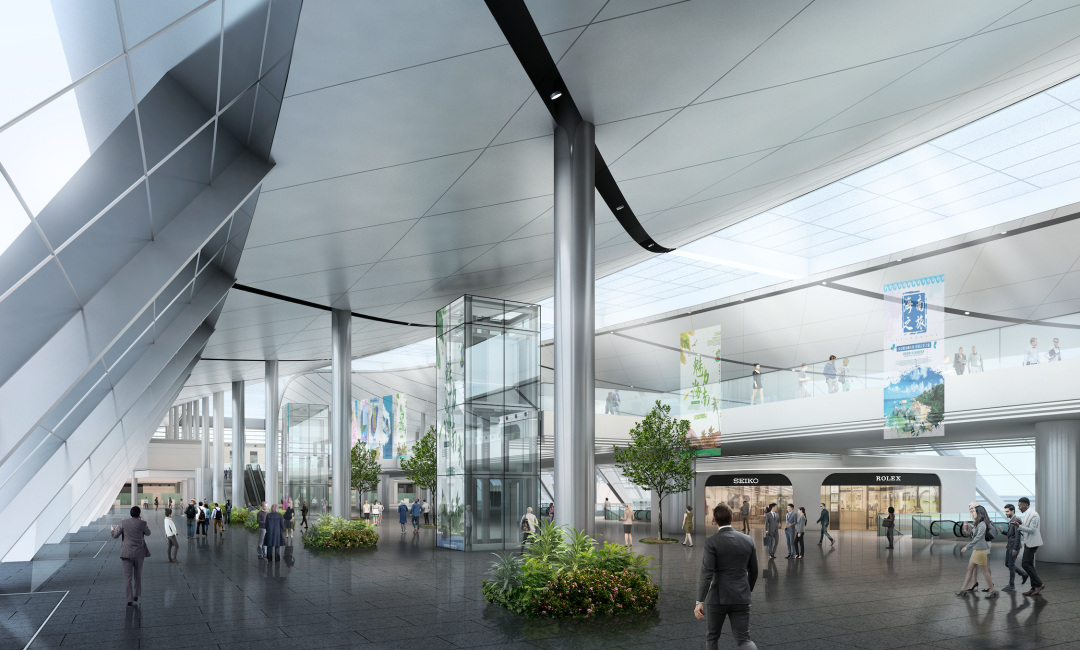 整体式的建筑处理,将主楼、侯船廊、地面交通中心(GTC)覆盖在一个连续的屋面之下。屋面的高低起伏,为下部各个功能区域提供了适宜的空间高度。流动的造型如浪潮澎湃、蛟龙出海,形成宏大的建筑气势。建筑首层仅保留必要的交通及办公空间,其余部分皆为架空层,保证5.5米以上的净空,最大限度的将场地利用起来,保证车行流线畅通无阻。