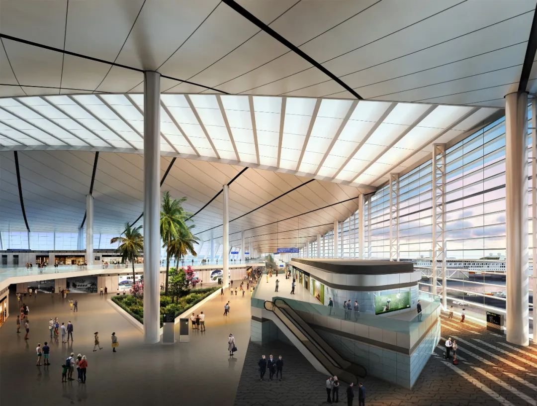 新航站楼连接大海和城市,是海口市的新海上门户。构型意向取自舒展修长的鳐鱼,以曲线勾勒的形体为基础,富有动感,充满活力。屋顶中脊和檐口两条曲线在陆侧延展,建筑底部架空,供进车辆通行-查验-等候使用。阵列的支撑构件如造船的龙骨搭建起主体建筑结构。屋面具有600米长的沿海展开面,对海上乘船旅客展示出张开双臂迎候的形势,成为开口放眼世界的新大门。