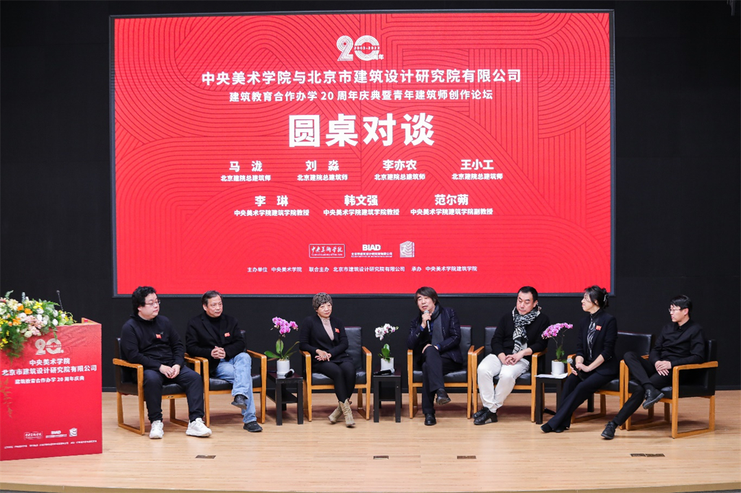 “青年建筑师创作论坛”同期举行,北京建院副总建筑师石华、青年建筑师王铮,中央美院建筑学院教授韩文强、副教授范尔蒴分别就各自的创作思考和近期作品进行了分享和交流。随后,北京建院总建筑师马泷、刘淼、李亦农、王小工,建筑学院教授韩文强、副教授范尔蒴,就“建筑师的职业乐趣和幸福感在哪里”“建筑师能力的培养”“女性建筑师在设计院中的位置与价值”“如何培养有艺术家素养”“人文素养的建筑师”等议题进行圆桌对谈,建筑学院党总支副书记李琳主持活动。