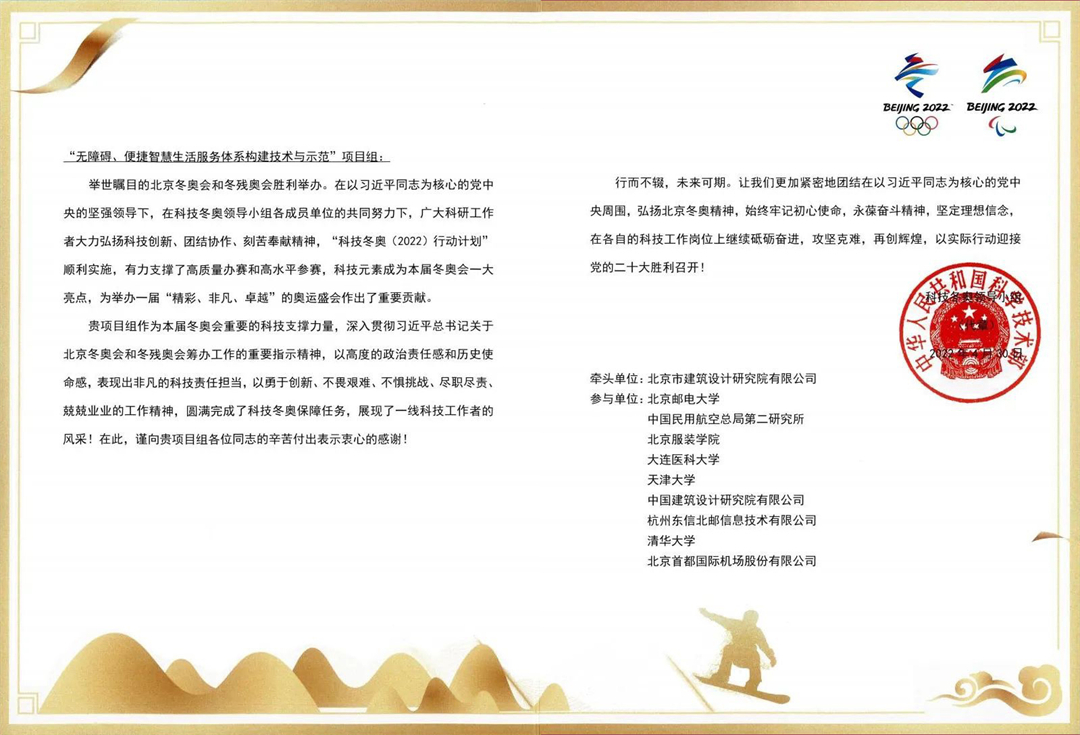 由北京建院牵头承担的国家重点研发计划科技冬奥重点专项项目“无障碍、便捷智慧生活服务体系构建技术与示范”顺利通过科技部项目综合绩效评价。项目所研发的一系列成果充分服务于北京2022年冬奥会和冬残奥会的无障碍需求,提升了北京2022 年冬残奥会的人性化、科技化服务品质,促进了基础性科研成果向应用性科研的转化,将作为宝贵的奥运遗产,推动我国无障碍建设上升一个新的台阶。