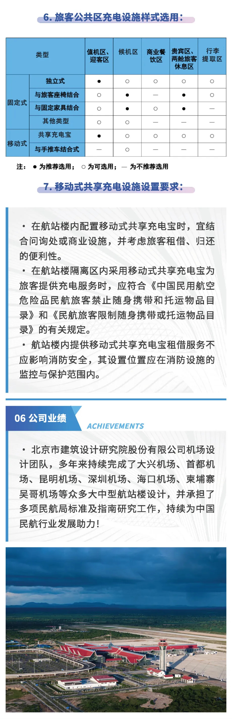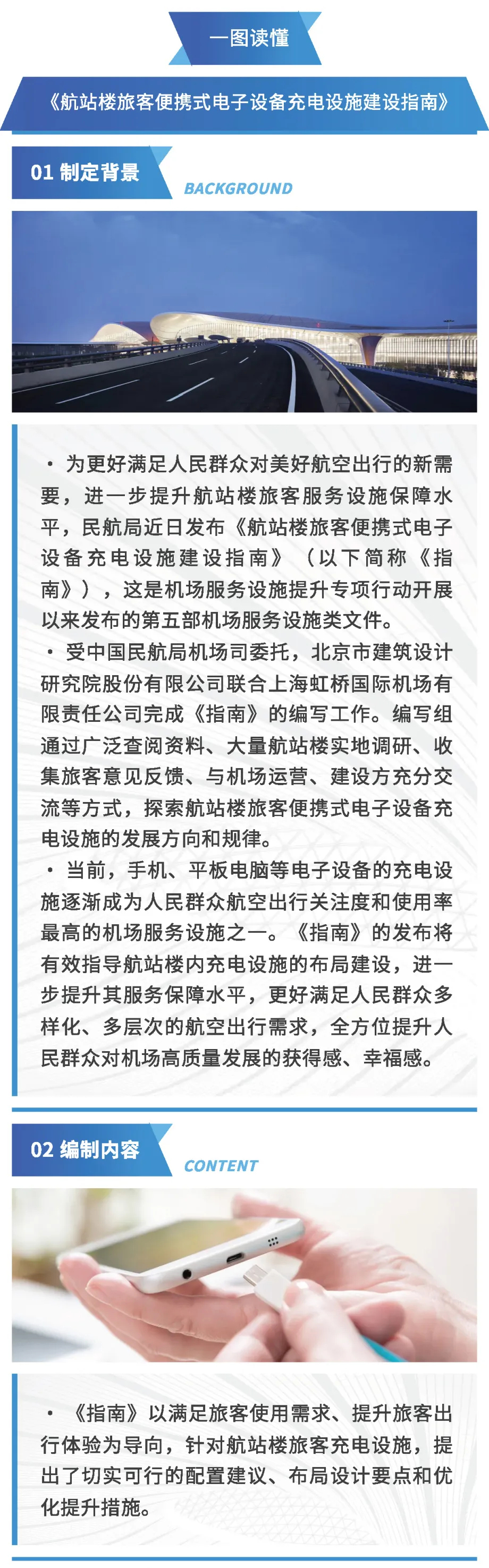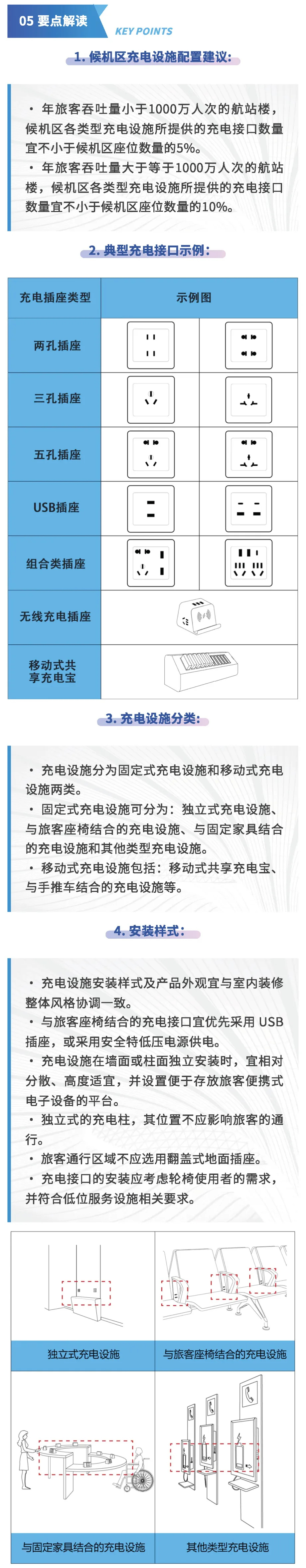 近日,民航局发布由北京市建筑设计研究院股份有限公司主编的《航站楼旅客便携式电子设备充电设施建设指南》,这是机场服务设施提升专项行动开展以来发布的第五部机场服务设施类文件。接下来带您一图读懂《航站楼旅客便携式电⼦设备充电设施建设指南》。