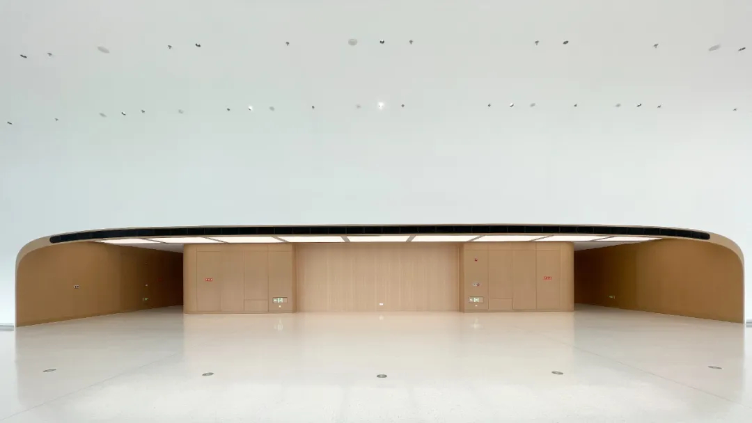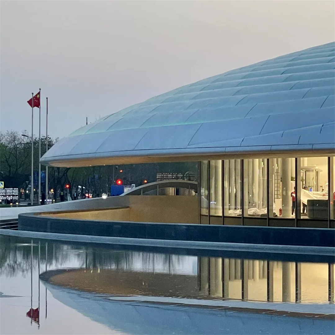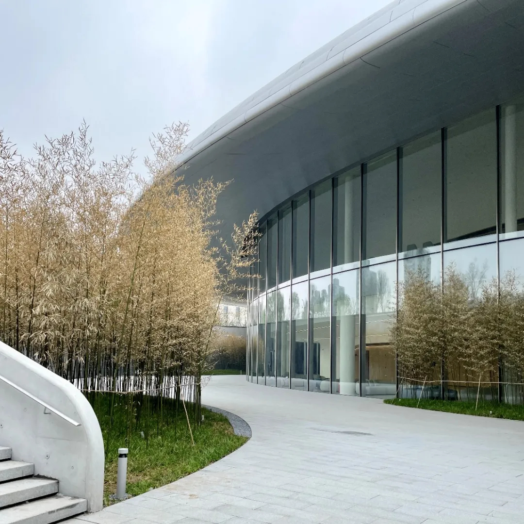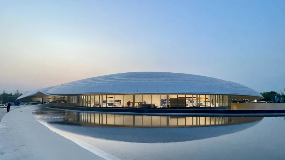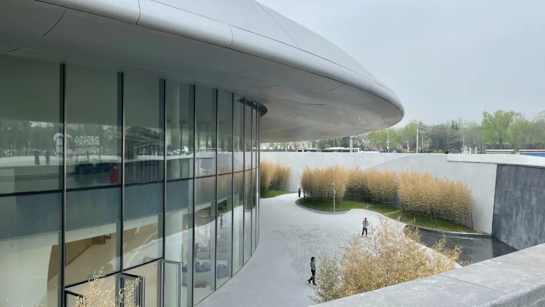 建筑造型充分考虑了“三山五园”地区自身的环境特点,用覆土建筑的方式大胆创造了无北立面的建筑,建筑伏于大地之上,由北向南缓缓舒展。遵从中国传统建筑注重“天人合一”的思想,强调建筑与环境的有机融合,挑檐深远而平缓。从不远处的三山向会址方向远眺,建筑体量消隐于城市中,绿色屋面以含蓄谦逊的姿态融入大环境中,也成为都市中难得的大地景观。