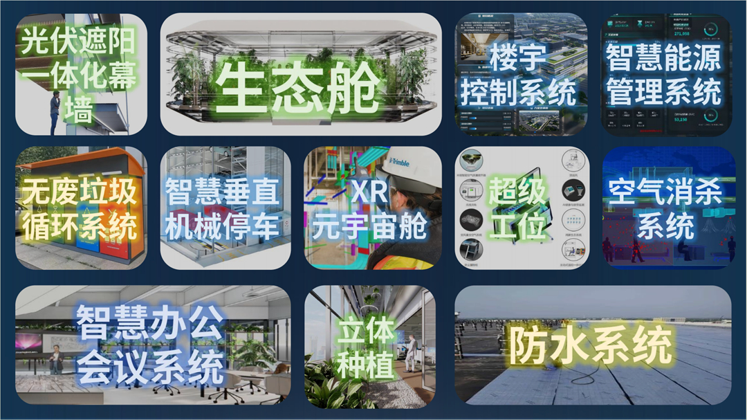 项目融合多项建筑科技创新,高性能集成幕墙系统、智慧能源系统、光储直柔、无废垃圾系统及智能末端、立体停车系统、超级智能工位、超级会议室、生态舱、元宇宙舱、立体种植技术、创新防水体系、传感器系统、智慧展厅等,开拓全周期建筑数字资产服务业务,积极探索建筑科技创新,科创团队发挥了重要作用。