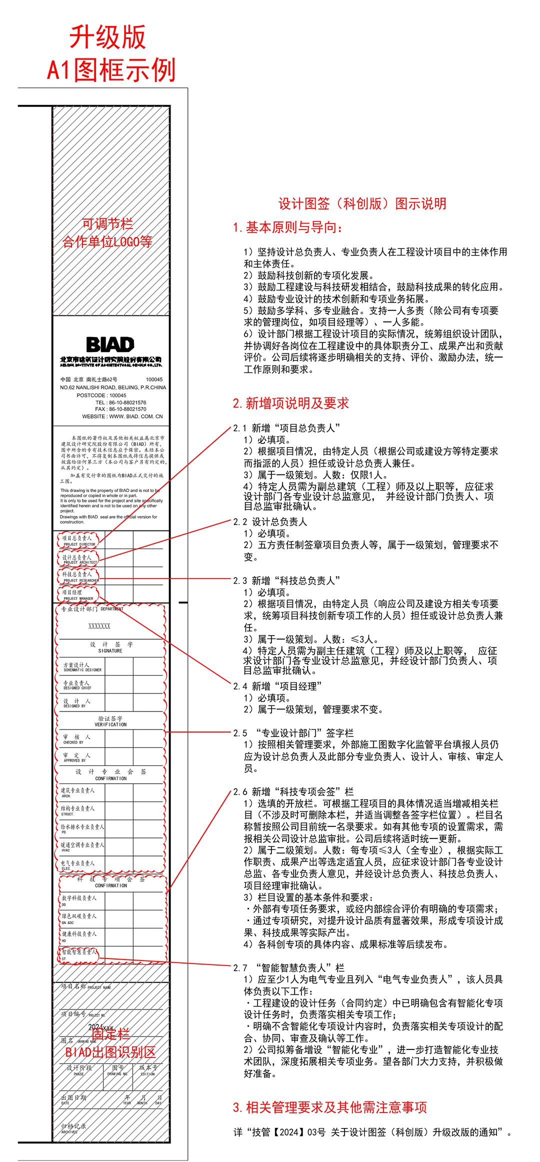 2024年7月11日,北京市建筑设计研究院股份有限公司对设计图签进行升级改版,鼓励科技创新工作的深入开展,特增设相关科技创新等专项工作负责人员会签栏。该项工作以国家和北京市高质量建设和科技创新发展的重大需求为导向,响应国家“十四五”建设发展规划和公司科技创新的发展战略,具有培育、激发北京建院科技创新能力,强化科技创新对设计能力提升、品质提升的重要作用,促进工程设计与科技创新的紧密结合。