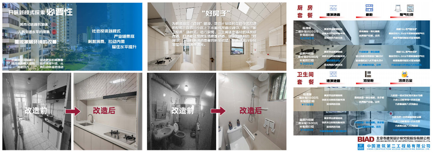 为进一步贯彻把“老房子”改成“好房子”的理念,并与老旧小区改造工作结合,精准地落实到最基本单元,精准地应对居民实际需求。2024年3月起,北京建院与中建二局华北公司联合在其正在实施改造的老旧小区项目中开展了“好房子”样板间进社区实践。项目以老旧小区改造为平台,针对厨房、卫生间上下水改造过程中的痛点难点,以及居民的实际需求,推出厨房、卫生间整体装修改造模块,进一步探索既有住宅更新新模式。