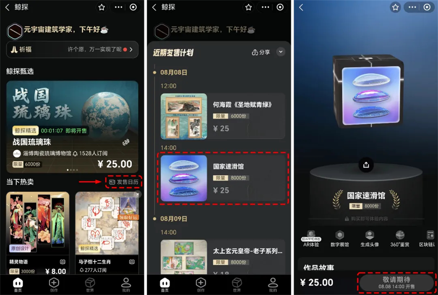 在首页的发售日历中找到“国家速滑馆”,点击进入藏品页面,右下角可设置购买提醒(8月8日14:00发售前)或点击购买(开售后)。