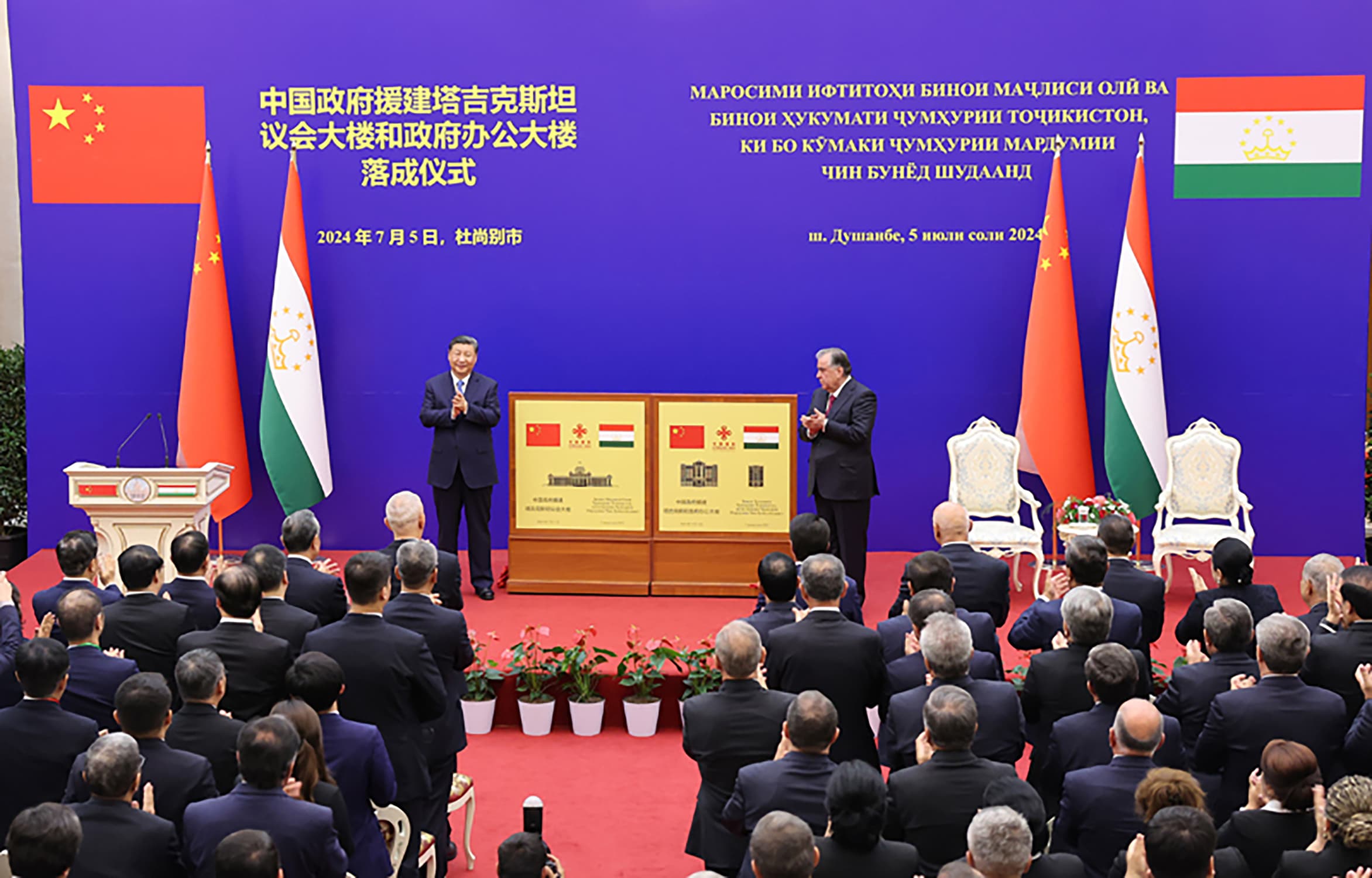 2024年7月5日下午,国家主席习近平同塔吉克斯坦总统拉赫蒙在杜尚别共同出席中方援塔议会大楼和政府大楼落成仪式。两国元首共同参观中方援塔议会大楼和政府大楼项目展板,共同为两座大楼揭牌。