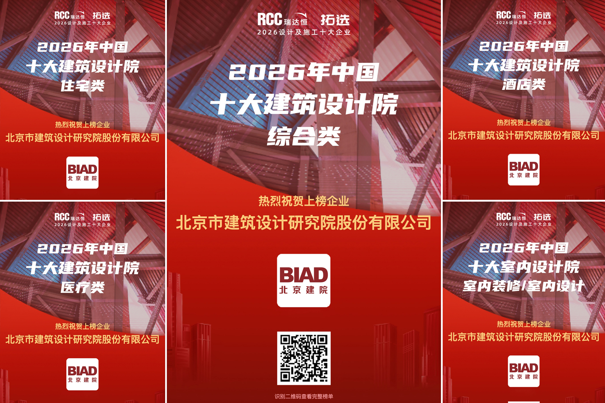 日前,2026年“中国建筑行业十大系列评选”榜单权威发布。北京市建筑设计研究院股份有限公司荣登“2026中国十大建筑设计公司”综合类榜单,同时入选四大类别细分领域榜单(酒店类、医疗类、住宅类、室内装修/室内设计)。