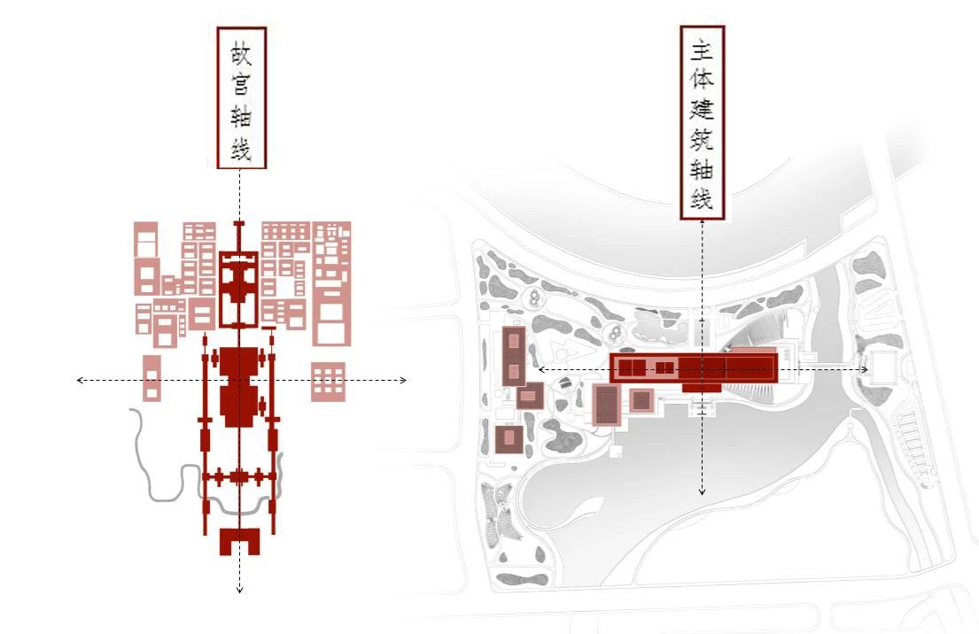 结合地形条件,在建筑的最终设计规划中,将对外文物展览布置在了场地东侧,较为私密的文物库房、修复及后勤功能则布置在场地西侧,最大限度满足功能布局的同时,也有利于分期建设。这种南侧临水、北面叠山的线性格局,也是呼应了中国传统“堪舆”理论的理想布局。“轴线是形制的根基。故宫有一条中轴线,北院区的中轴线也是寓意故宫核心‘天际线’。我们想通过这种均衡的轴线布局方式与散点的构成逻辑向紫禁城致敬,也是在传承着故宫的历史文化底蕴。”
