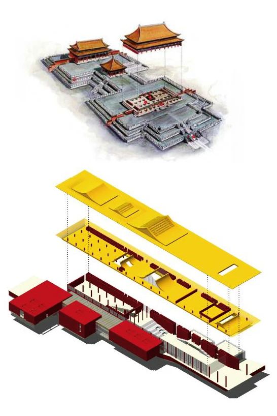 从建筑立面看,由屋顶、屋身和台阶组成的三部分,亦是仿照中国古典建筑外形的“三段式”构图法。金色重檐屋顶之下是红墙围合而成的屋身,屋身之中还借用华丽而有韵律之美的窗棂作为表皮肌理,首层大台阶则结合着草坡将首层自然抬起。同时,这种“三段式”的立面布局也与功能布局相呼应,满足从下至上的综合服务、常规展览、特殊展览与观景游廊的布置方式。