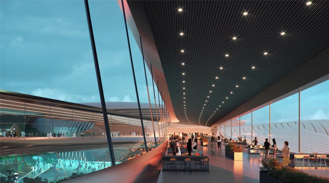 增强绿色、低碳、可持续发展能力 融合生态公园景观,凸显智慧科技赋能,助力营造区域新的标志活力街区,提升整体城市品质。连廊空间在会展期间承担配套服务和休闲交流功能,与室外庭院景观互动提升空间品质感。