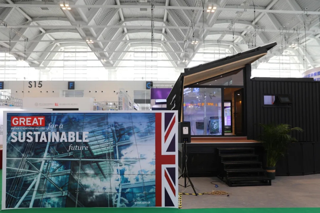 英国驻华大使馆国际贸易部率代表团在此次博览会中展示了英国建筑设计公司零碳工场(Zedfactory)打造的最新零碳建筑成果——英国零碳小屋(UK ZeroCarbon House),并举办了“中英可持续发展社区与建筑高峰论坛”。英国驻华大使馆英国国际贸易部贸易副使节杜涛、中国住房和城乡建设部计划财务与外事司二级巡视员李喆、中国贸促会建设行业分会会长李礼平、天津市商务局会展经济处处长施纯、天津市对外经济合作协会会长周文焕、国家会展中心天津分公司负责人王珏、零碳工场中国区总经理高巍出席活动,北京建院党委书记、董事长徐全胜参加零碳小屋亮相仪式并致辞。