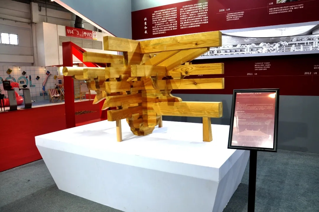 现场展示1:3比例的佛光寺大殿外檐柱头铺做的斗栱模型,力求精准展示中国古代建筑斗栱的结构和装饰功效。