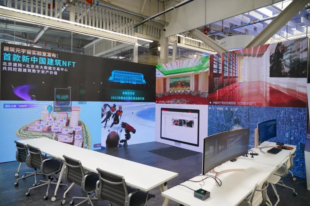 在建筑元宇宙实验室,调研组参观了实验室即将发布的由北京建院与北京市国际大数据交易所共同推出的首款新中国建筑NFT数字产品首都体育馆以及元宇宙系列产品—METALAND,其以北京建院南礼士路院区为映射打造元宇宙场景,可通过虚拟角色进入该元宇宙,在线获取北京市建筑设计研究院股份有限公司场景体验。